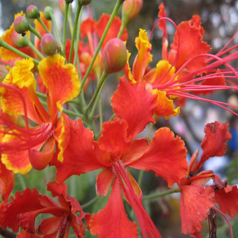 Appearance: Caesalpinia pulcherrima is a deciduous or semi-evergreen shrub that can reach heights of 3 to 5 meters (10 to 16 feet) and spread up to 3 to 4 meters (10 to 13 feet). The leaves are fern-like, alternate, and compound, consisting of multiple pairs of small, oval-shaped leaflets. The flowers are the highlight of this plant, with large clusters of striking red, orange, and yellow blooms. The flowers have long, prominent stamens and attract pollinators such as bees, butterflies, and birds.