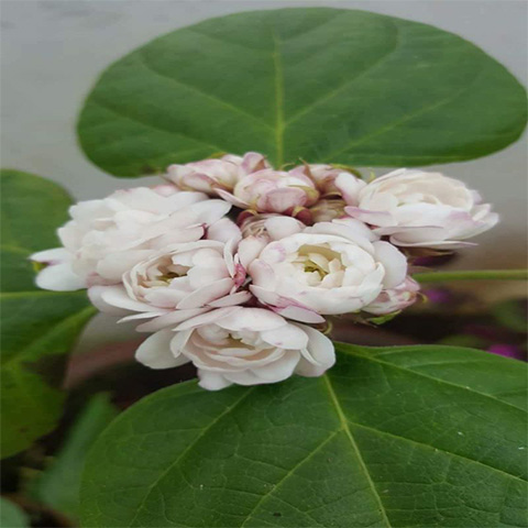 Erect subshrubs, to 2.5 m tall, mostly unbranched, younger portion densely short-pubescent. Leaves 8-20 x 6.5 - 18 cm, broadly ovate, base cordate or truncate, margin coarsely and irregularly dentate, apex acuminate, basally 3-veined, pubescent, chartaceous; petiole to 18 cm long. Flowers in terminal condensed cymes, short-pedunculate, often subtended by a pair of foliaceous long-stipitate bracts. Calyx 1-1.5 cm long, campanulate, red-purple, with scattered circular glandular disks; lobes 4-8 mm long, lanceolate, acuminate. Corolla white, hypocrateriform, double, very fragrant. Stamens and pistil all modified into supernumerary petals.